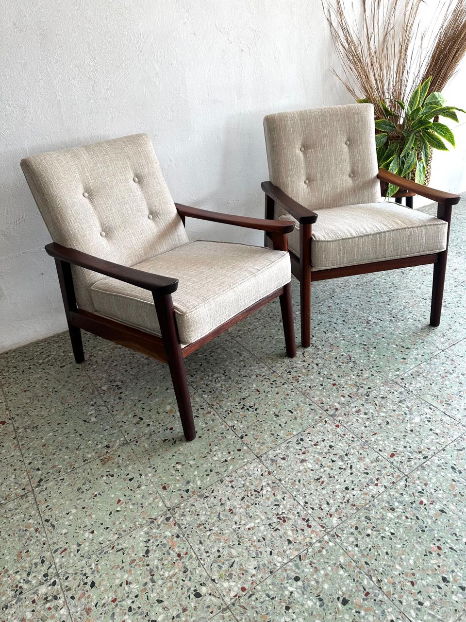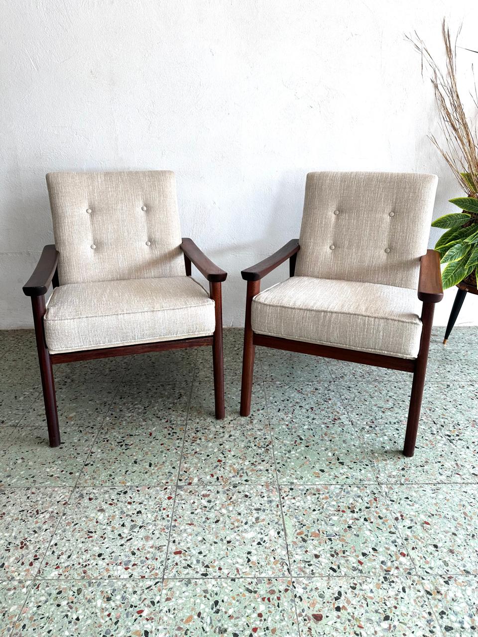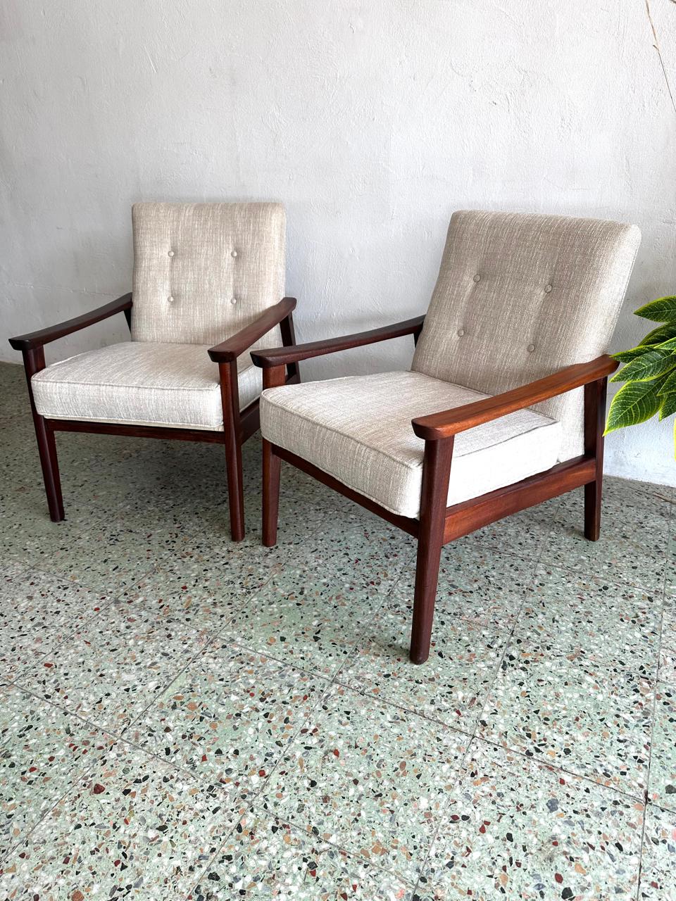 Elegant Mid Century Modern Arm Chairs, comfortable seating and suitable for any living space or interior decor. Newly upholstered